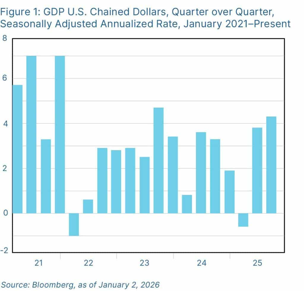 The highlight was the first look at GDP growth in the third  quarter, which came in well above expectations. As seen  in Figure 1, the 4.3 percent annualized growth rate  marked the best quarter for economic growth in more  than two years. Encouragingly, personal consumption  growth was a major driver of overall economic growth in  the quarter. Despite the strong headline growth, however,  there were signs of potential risks ahead. Hiring slowed  notably in the second half of the year, prompting the Fed’s  policy pivot. A healthy labor market is critical for  sustaining consumer demand, so this trend bears close  monitoring. While recent data releases were delayed and,  in some cases, even canceled due to government  shutdown disruptions, the partial updates confirm a  largely cooling employment backdrop.