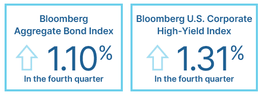 Fixed income investors enjoyed a strong year as falling  interest rates boosted bond prices. The Bloomberg U.S.  Aggregate Bond Index fell 0.15 percent in December but  gained 1.10 percent in the fourth quarter and a strong  7.30 percent for the year.